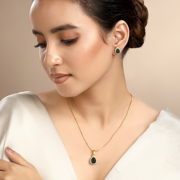 This necklace set is handcrafted in 925 Silver and embellished with cubic zirconia diamond and synthetic green stone.