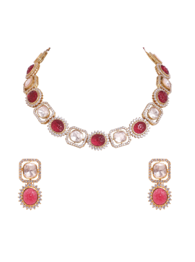 This necklace set is handcrafted in 925 Silver and embellished with Moissanite Polki, synthetic red stone and Cubic Zirconia diamond.
