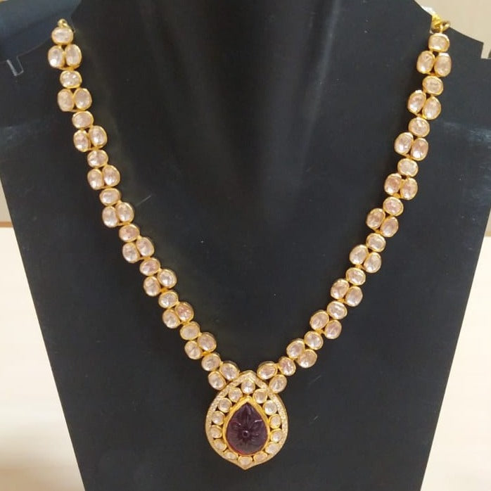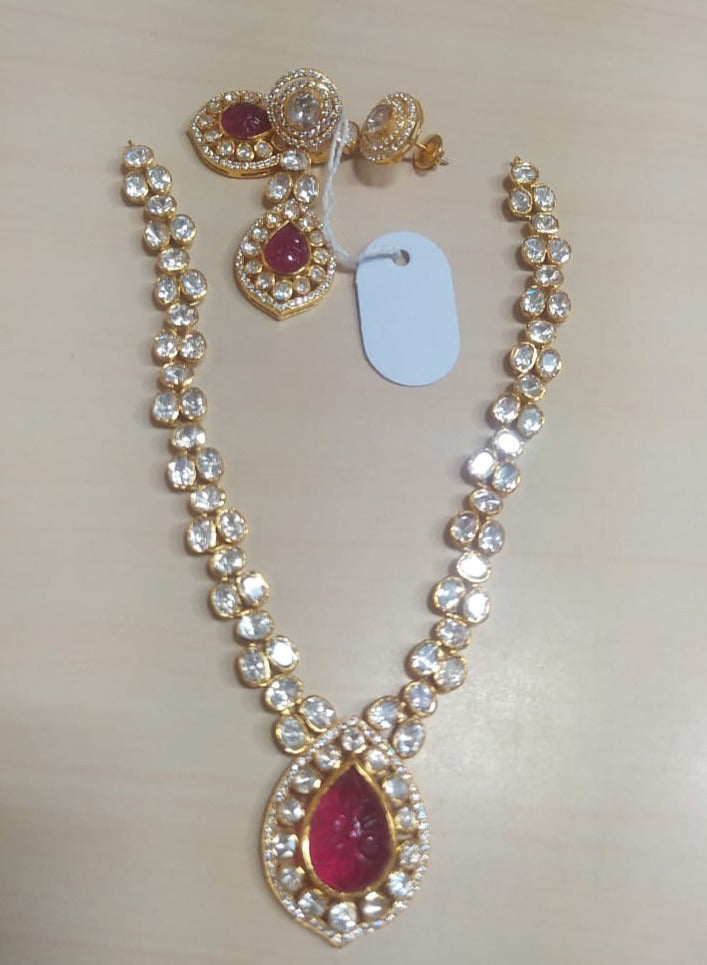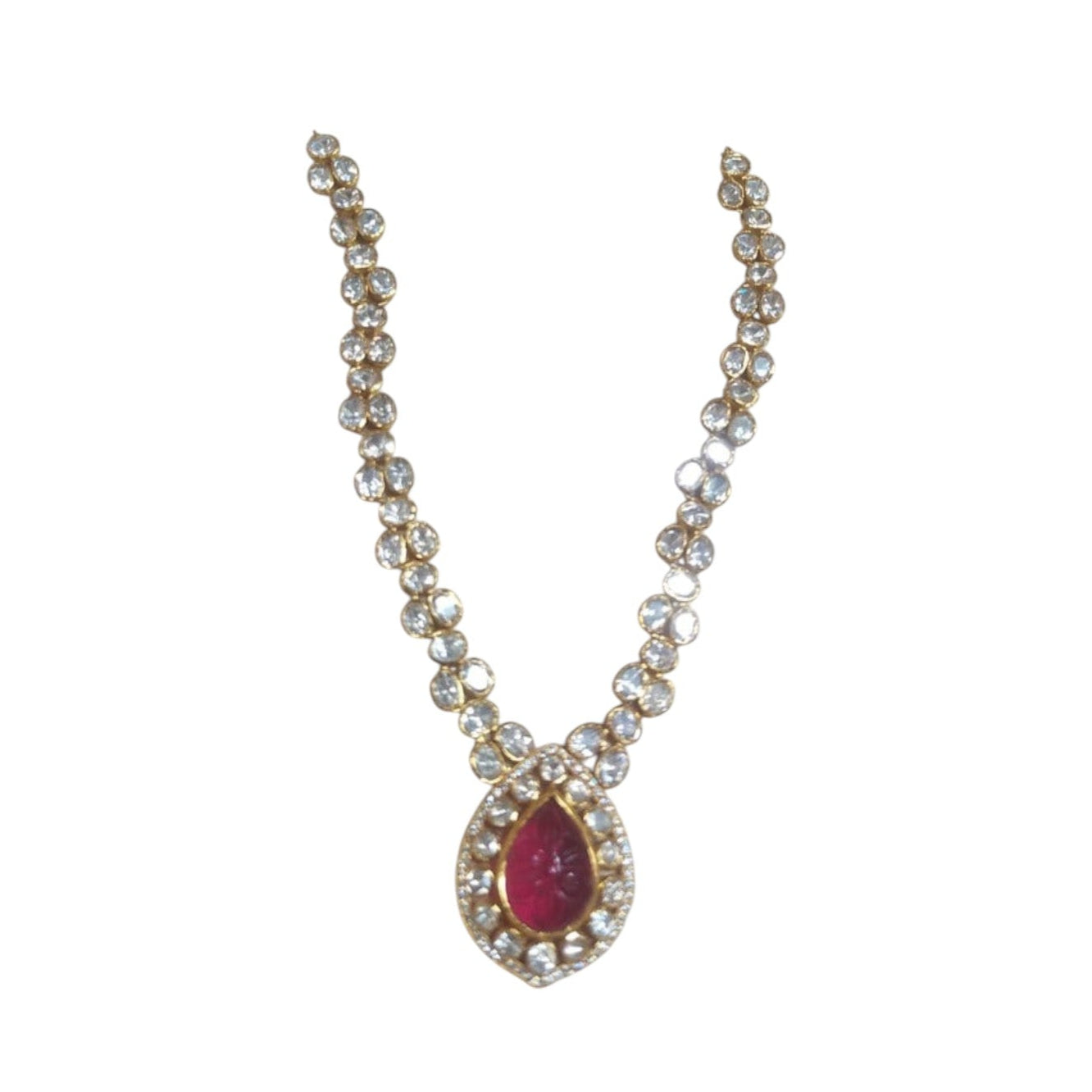 925 Silver Moissanite Polki Carved Red Necklace Set