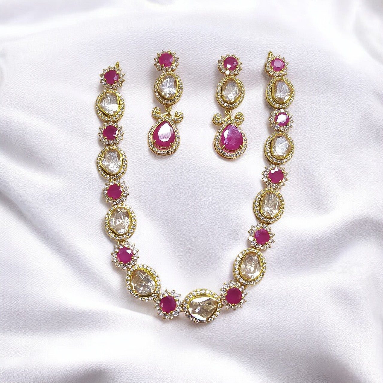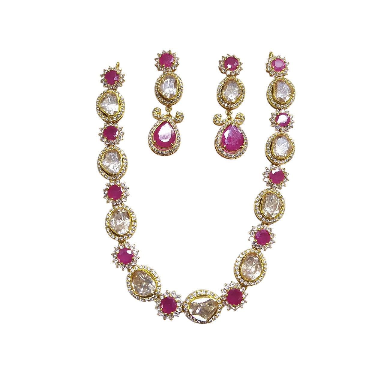 925 Silver Moissanite Polki Faux Ruby Necklace Set