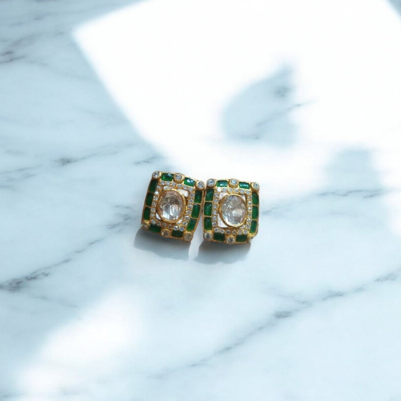 925 Silver Moissanite Polki Green Rectangle Earrings